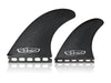 This setup will work well in swallow tail thruster set ups, hybrid fishy/thruster shapes, and any board for which a smaller twin + stabilizer setup is functional. Despite being designated as a thruster, the larger side fins lie somewhere on the spectrum between large thrusters and smaller twins so they will offer a lot of room for experimentation in a range of boards. The Bessell Thrusters fit the role of a highly functional "thruster & twin + stabilizer hybrid."