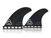 Stu's quad set is a balanced template that was designed to work in both performance shortboards, step-ups, as well as fishy boards. The flat foiled front fins are paired with 80/20 foiled trailers for a clean, smooth flow that turns effortlessly.